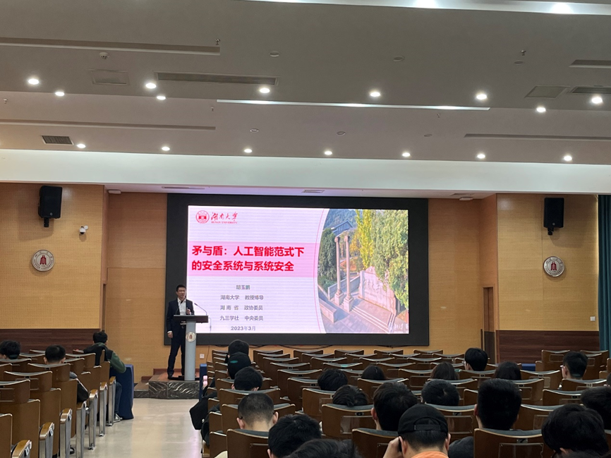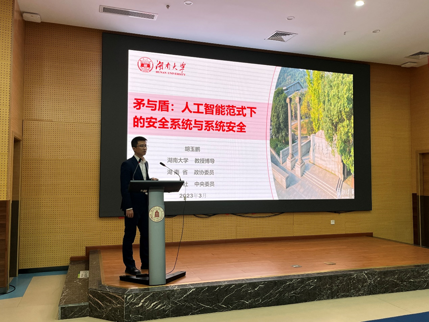 2023年3月9日上午。学院邀请了湖南大学信息科学与工程学院胡玉鹏教授在线下为Beat365官方网站师生带来了一场题为“矛与盾:人工智能范式下的安全系统与系统安全”的学术讲座。